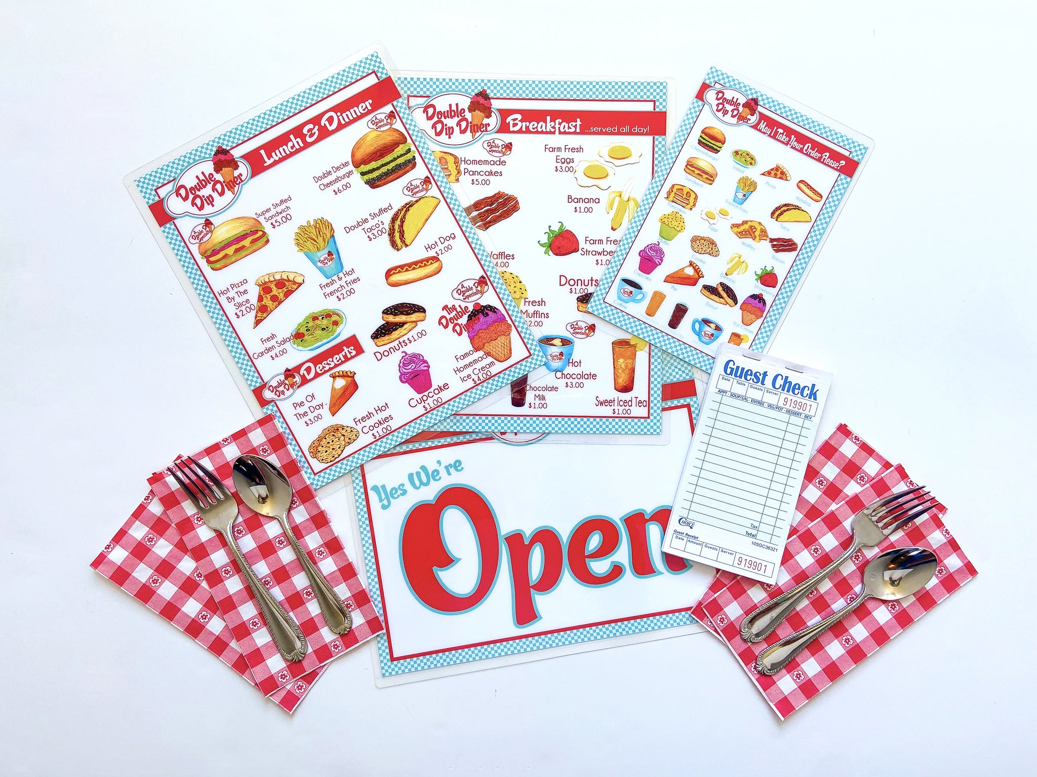 Realistic menus, guest checks, food tickets, and restaurant-grade details that turn any kitchen or playroom into a nostalgic diner. Kids LOVE taking orders and “serving” breakfast, lunch, and dinner just like we did growing up.